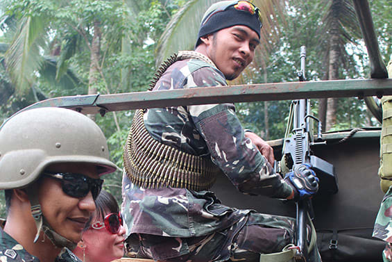Filipino infantrymen prepare to escort a civilian through an Abu Sayyaf Group ambush route in Basilan. Photo: Matthew Thompson.