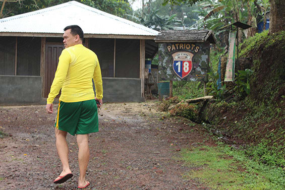 Lt Col Paolo 'Tiny' Perez, commanding officer of the 18th Infantry Battalion in the rebel-dominated municipality of Tipo Tipo, Basilan, strolls his headquarters after a morning hip-hop dance workout. Photo: Matthew Thompson.