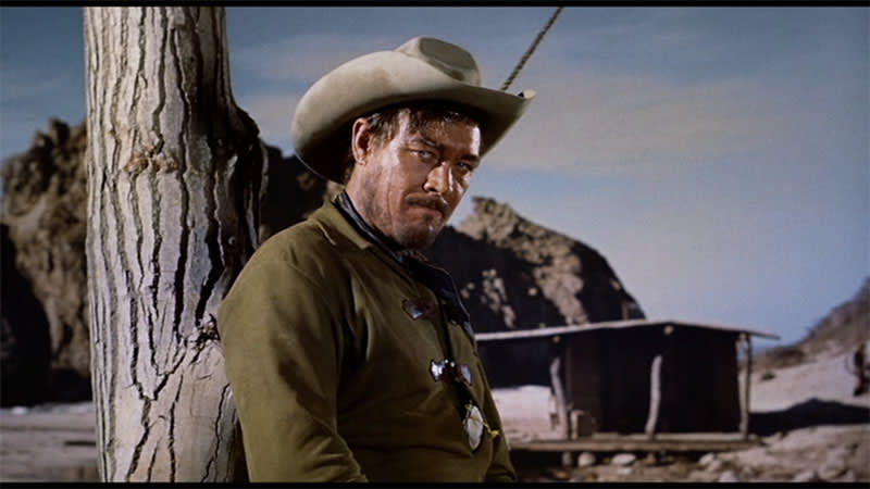Aspects of Hendry Jones are remixed and reworked in Brando’s imagination. The cowardly and brutal violence of the killing of the sixteen-year-old Modesto finds expression in two comparably shocking scenes in the film: the public whipping of Rio by Longworth, which begins with the sheriff ripping Rio’s shirt to expose his back to the whip, and which ends with him smashing Rio’s right hand with the stock of a shotgun; and Bob Amory’s cold-blooded killing of Modesto (Larry Duran), Rio’s jailbreak buddy, and a significant Mexican presence in the film. Amory (Ben Johnson) has taken the cartridges from Modesto’s gun, leaving him helpless in their confrontation, and taunts him by spelling out ‘g-r-e-a-s-e-r’ before shooting him dead.