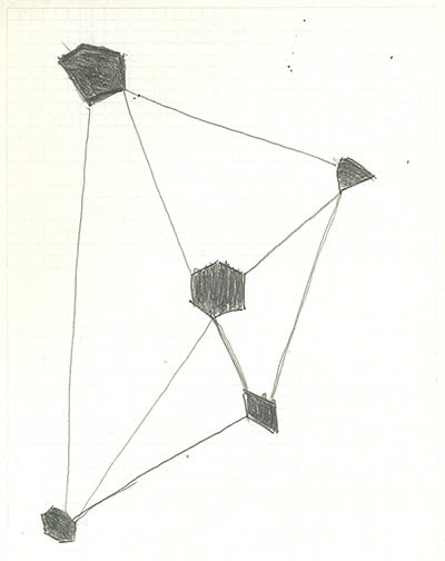 I would sometimes, during the planning of a piece of fiction, see my polygons and connecting lines as a map of some or another remote district of my mind, with the polygons suggesting townships and the lines suggesting roads or rail lines.  Sometimes the diagram might seem to represent a solar system, reminding me that my mind comprised not only varieties of my favourite level landscapes but a starry firmament overspreading them.  Or sometimes, in a mood to reduce things to their simplest terms, I would see a diagram as the narrator of ‘In Far Fields’ would have claimed to see it : as proving that his mind consisted only of images connected by feelings.