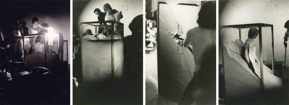 Unsworth also recalls that when he saw Gilbert and George performing their Singing sculpture, the idea came to him that within the general context of using natural materials in his art, the human body could be used as one such natural material for sculptures. Unsworth’s Five secular settings for sculpture as ritual, and Burial piece was performed before a live audience at Central Street in Sydney in 1975. Although very few people saw Unsworth’s performance and most recall the event through photographic stills of the dramatic tableaux, it was this piece that established his reputation as a performance artist. His Australian contemporaries, Mike Parr and Stelarc, who also participated in body art and, whether through faked amputations or real meat hooks imbedded in the body, played with the dimension of actual human pain. Unsworth’s poses pinned with beams of wood or the body involved in a slow burial, may have been uncomfortable, but the impact was dramatic with a strong aesthetic accent, rather than one dependent on the cringe factor of perceived pain.